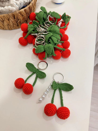 This handmade crochet cherry keychain adds a charming touch to your keys or bag. Made with attention to detail.