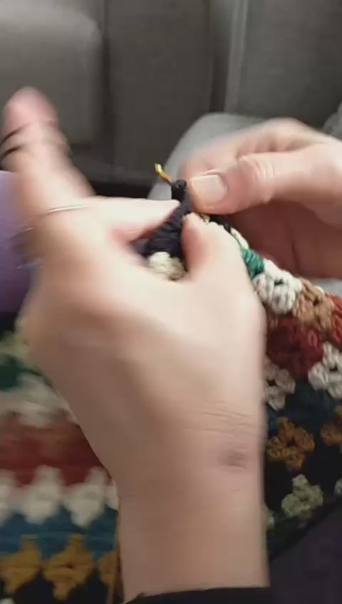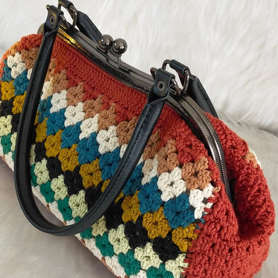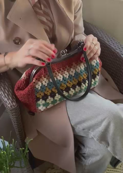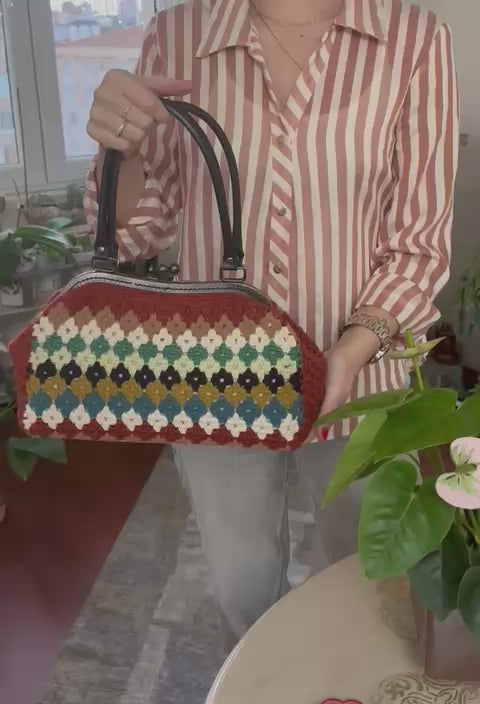Handmade crochet bag made from cotton yarn! With granny square pattern in vibrant colours. Comes with metallic secure closure and leather handles.